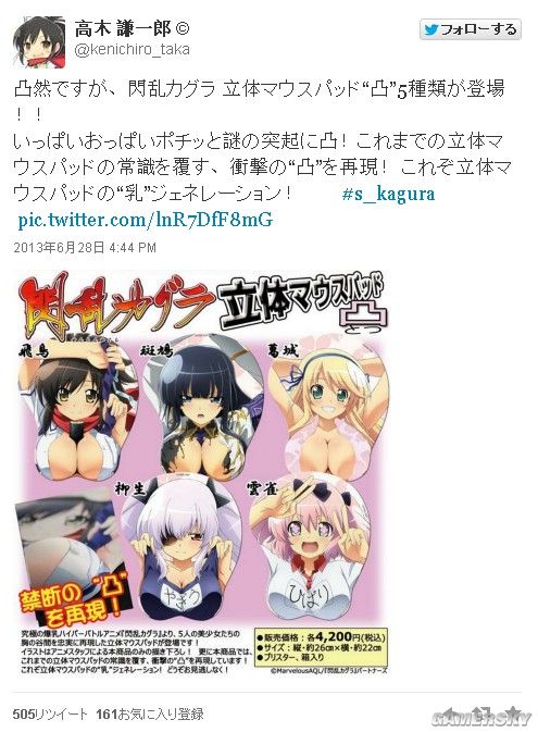此外,游戲制作人高木謙一郎還在個人推特上發布了幾款“閃亂鼠標墊”,包括飛鳥、斑鳩等人物,爆衣撕裂很有質感。